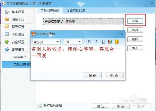 点击一下新增,设置您想自动回复的话。例如,我设置的:咨询人数较多,请耐心等等,客服会一一回复。点击一下保存。