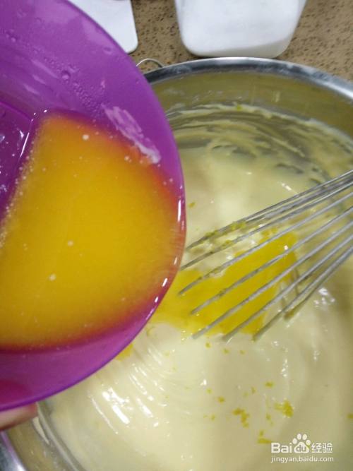 先加三分之一的蛋白霜到蛋黄糊里,翻拌匀