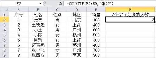 在F2单元格输入公式:=COUNTIF(B2:B9,"张??")