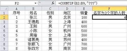 在F2单元格输入公式:=COUNTIF(B2:B9,"???")
