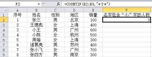 在F2单元格输入公式:=COUNTIF(B2:B9,"*小*")