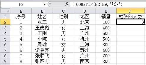 在F2单元格输入公式:=COUNTIF(B2:B9,"张*")