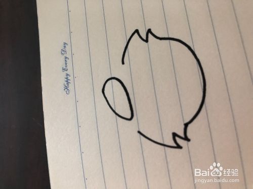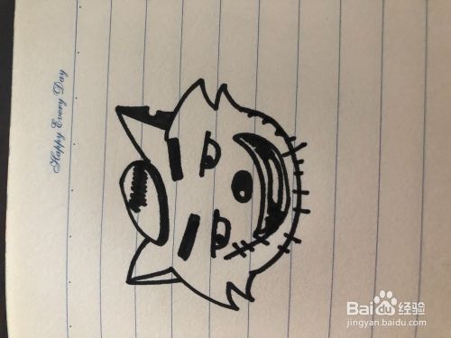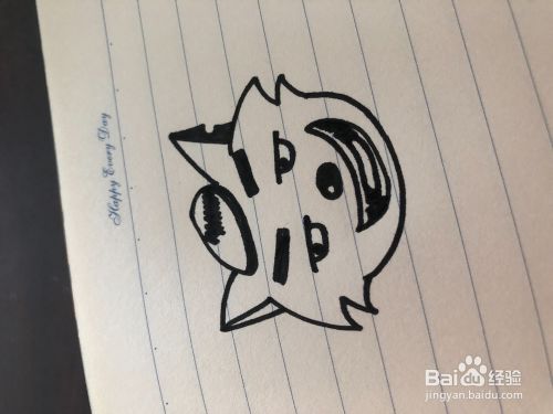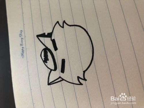 第四个步骤就到了他的眼睛他的眼睛是稍微倾斜的线条,加上眼珠子和他的鼻子。