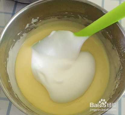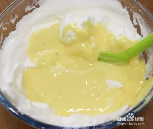 蛋清糊糊和蛋黄糊糊搅拌的时候不能划着圈使劲搅拌,这样可能就把打法的蛋清消泡泡了,烤出来也就不蓬松了。在将前面材料拌进蛋白霜里的时候要轻轻拌进去,同时,也要注意不要消泡了。