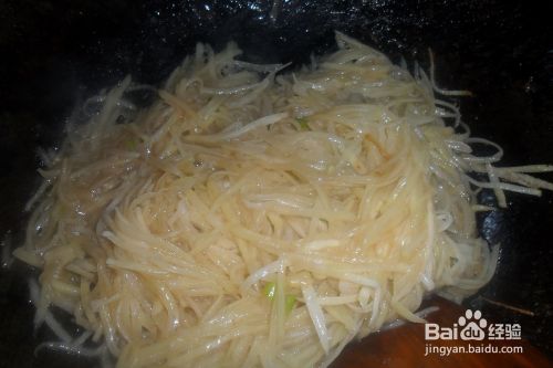 捞出地蛋丝,放入锅中,加醋,盐,不断翻炒。若是粘锅,就续上一点水。