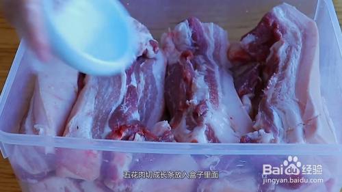 五花肉切成长条放入盒子里面,加入30毫升白酒抓拌均匀。