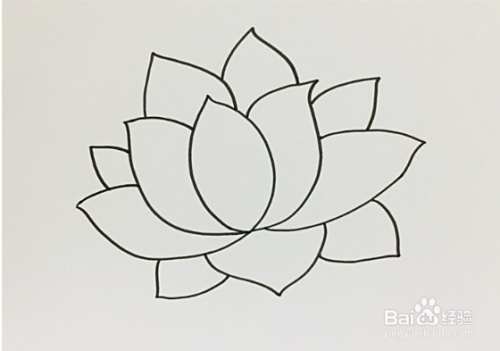 继续补充荷花的花瓣,往两侧延伸、补充,注意花瓣的顶部线条都是有弯曲的,完整的花朵就画出来了。