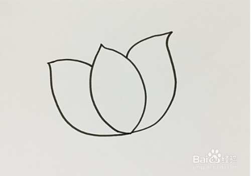 首先我们画出荷花的花瓣,先画中间一瓣,花瓣的形状是中间饱满,两头尖尖的状态,在两侧画上两瓣花瓣,注意尖部线条。