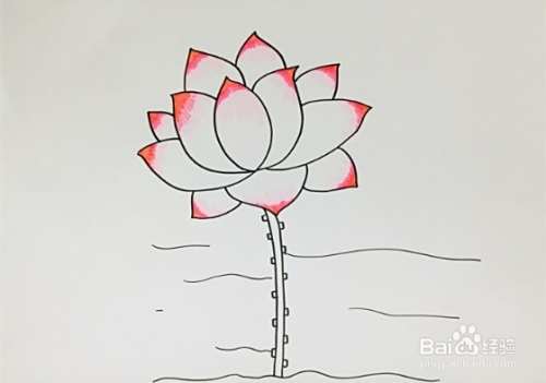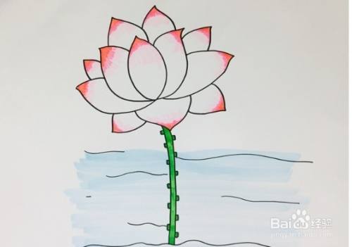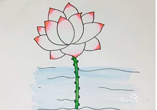 首先画出荷花的花瓣,花瓣的形状是中间饱满,两头尖尖的,继续补充花瓣,往两侧延伸、补充,再来画出荷花的茎,画上水纹,先给花瓣涂淡淡的粉色,注意顶部要涂深红色,茎涂深绿色,并给水面涂浅蓝色,荷花简笔画就完成啦!