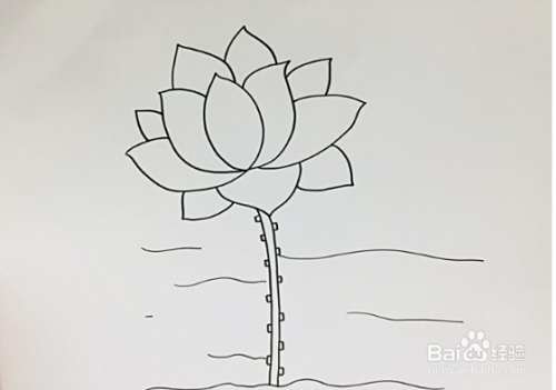再来画出荷花的茎,它的茎笔直,在茎两侧画上尖刺,荷花下方画上水纹代表水面。