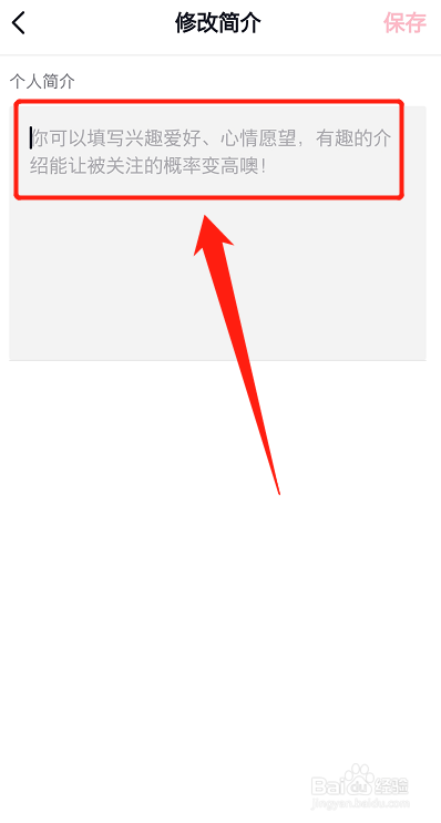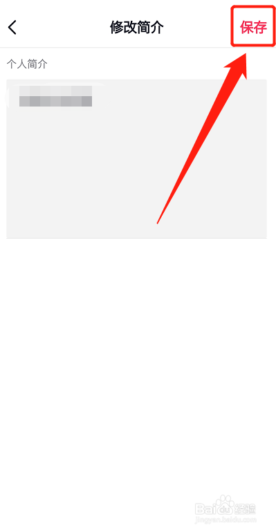 接着我们输入自己个人简介的“内容”,填写好之后,点击页面右上角的“保存”,这样抖音就修改好个人简介了。