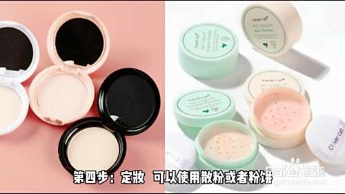 第四步定妆,可以使用散粉或者粉饼。如果你是油皮,一定要做好全脸定妆,否则会脱妆很快,如果是干皮可以着重T区的定妆,其他区域轻轻带过即可。到这里,底妆就完成了。