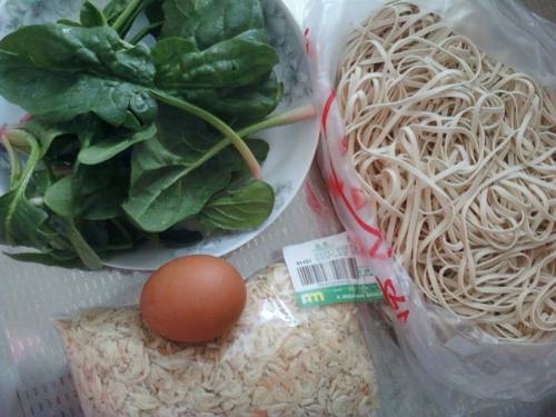 1、准备面条、菠菜、鸡蛋、虾皮。