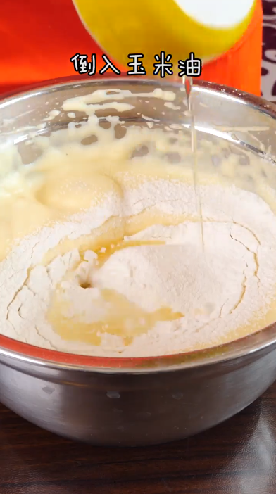 筛入低筋面粉、加入玉米油,搅拌均匀。