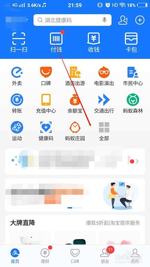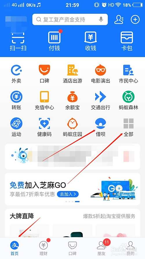 第二步,点击页面下方的首页,可以在首页上方展示中看到借呗,点击全部选项,如图所示: