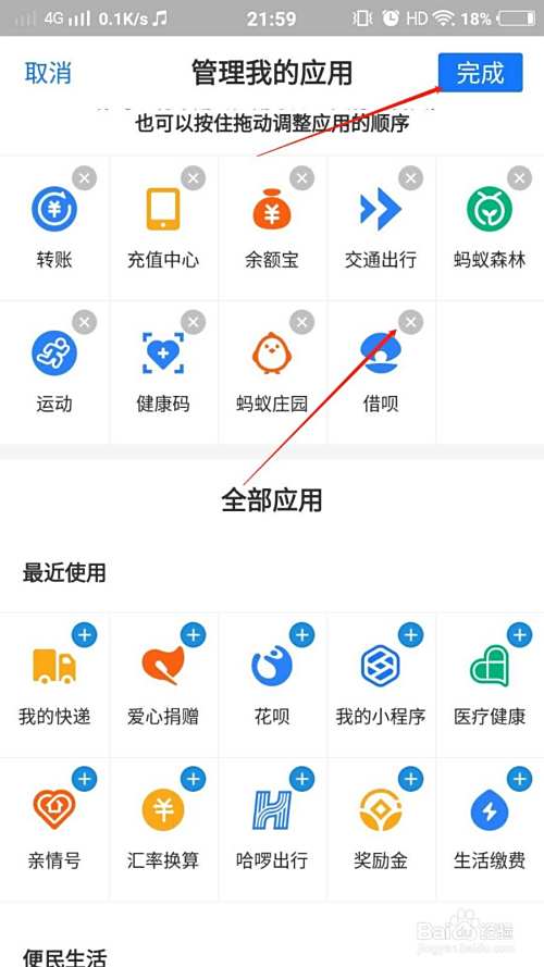 第四步,在首页中展示的应用全部展开时,长按任意一个应用,然后在编辑状态先点击借呗右上方的消除符号,然后点击完成,如图所示: