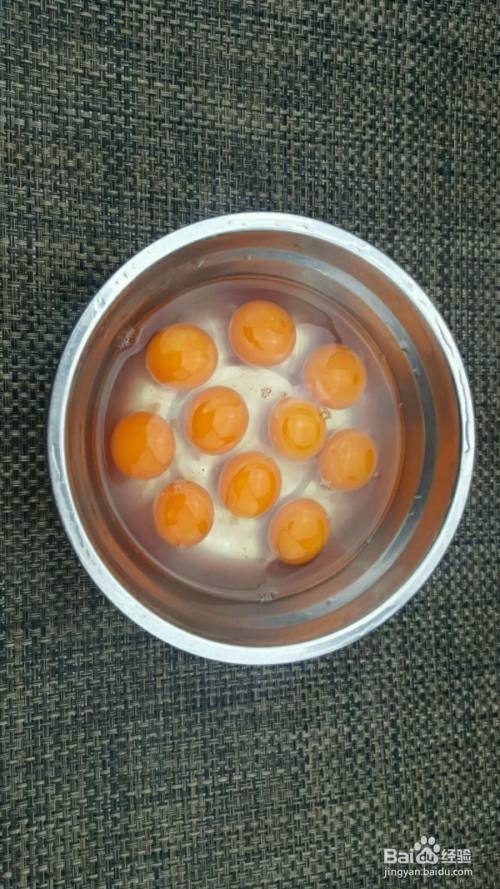 第三步制作橄榄形欧姆蛋,先在大盆中打入10个新鲜蛋