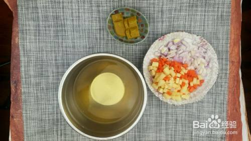 先制作咖喱酱汁:将洋葱胡萝卜土豆切成小丁,鲣鱼白酱汁兑水50倍成约1升,咖喱块切小。