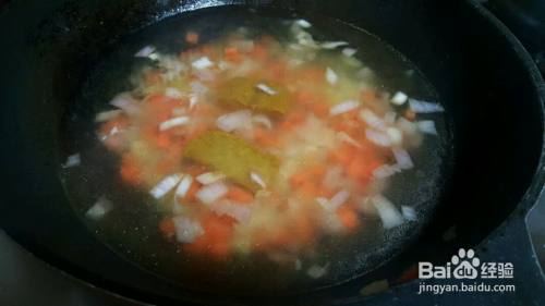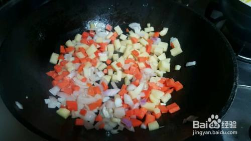 起油锅,先炒洋葱至微黄,再炒土豆胡萝卜,洒少量盐让蔬菜变软。