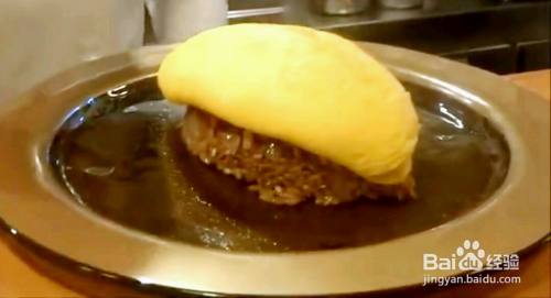 用刀尖划开欧姆蛋,整个蛋完全翻转包住炒饭,里面柔嫩的蛋液让人垂涎欲滴