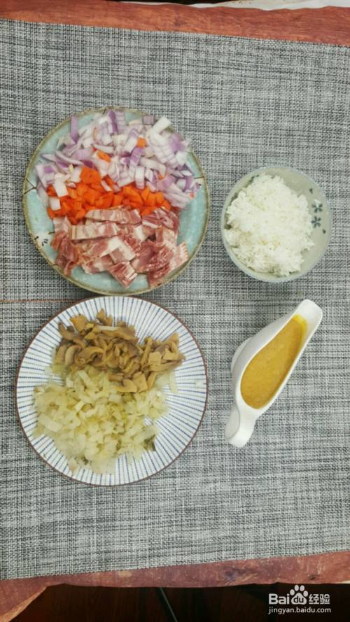 关火后倒入料理机打成顺滑的咖喱酱汁,图上酱汁杯中咖黄色的就是,留这样5安士一杯炒饭用,其余用来浇蛋包。此图为炒饭所有配料,这次我用了腌白菜帮,大家随心所欲制作炒饭。