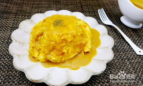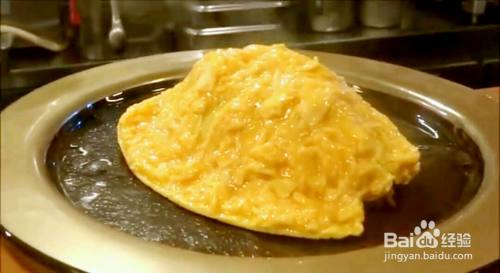 制作欧姆蛋的关键是速度要相当快,整个过程就在30秒之内完成,欧姆蛋要一个一个分开制作。起油锅,先试油温,蛋液滴到油中迅速炸开表示油温已够,将200毫升蛋液倒入,在3秒内用筷子迅速划散,移锅,将半熟的蛋液倒入盆中继续划散至浆状,再起油锅,依然试油温,把蛋液重新倒入至锅的一边,迅速用胶铲把蛋液向锅边铲,一边铲—边颠锅,重复三次,橄榄形欧姆蛋就成形了,离火,将蛋移至炒饭上。整个过程虽用那么多文字,其实只在30几秒的过程中完成。