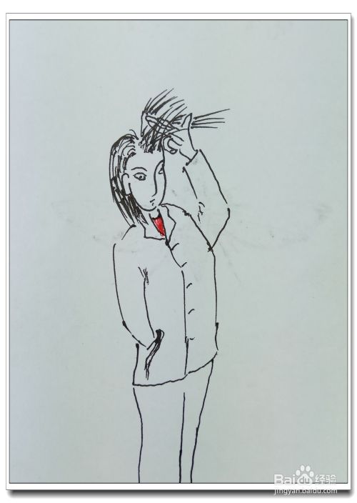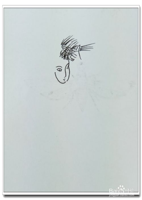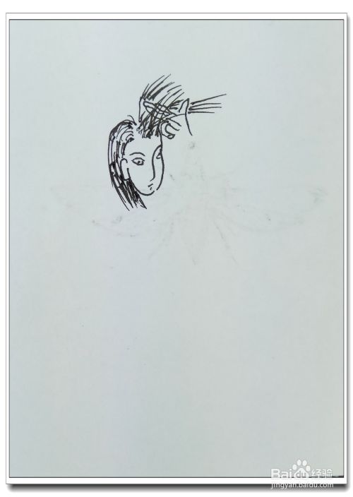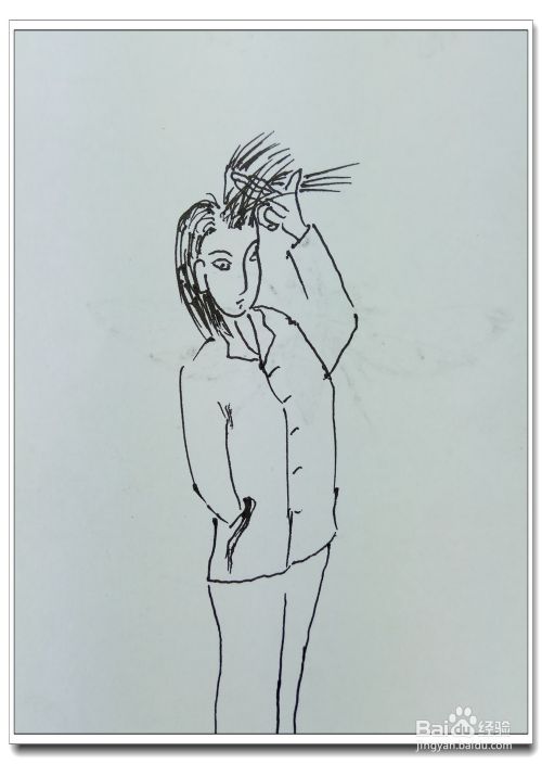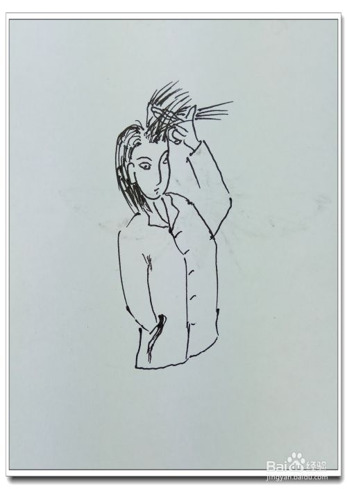 在白纸上用曲线和弧线画出一个人的头部轮廓,并画出五官和头发,她正在用手指理头发呢。