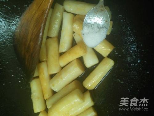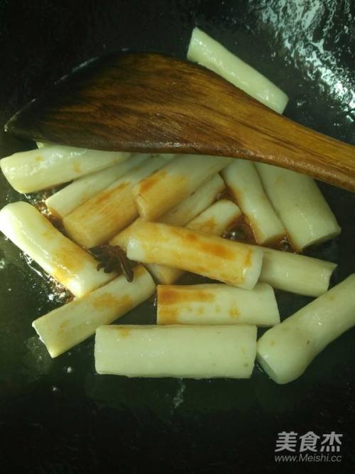 放入山药,倒入老抽,加入八角翻炒半分钟左右