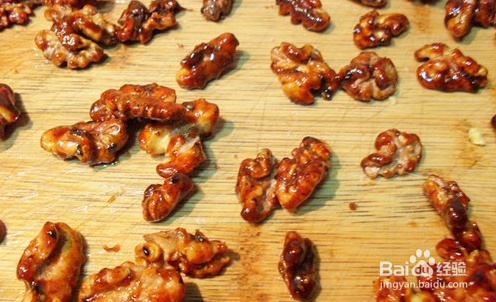 5.裹好糖浆的核桃仁用锅铲盛起,用筷子夹起来一个一个分开,摆放在包好怕国保鲜膜的砧板上晾凉。待晾后就可以吃了。
