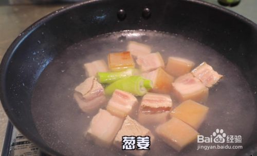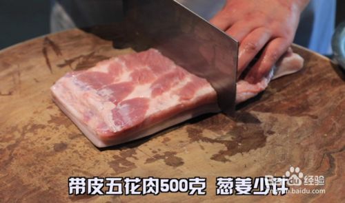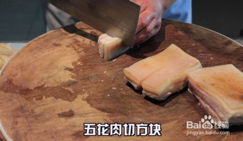 准备带皮五花肉,按图中样式大约切成大正方形,葱切段,姜切片
