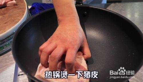 把锅加热,锅内不要加任何东西,待锅热后,手拿猪肉烫一下猪皮(像图中样式),要把猪皮均匀的烫到,可以转圈烫,烫到猪皮上有焦黄色。
