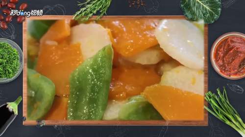 1葱切沫,南瓜切片,柿子椒去籽,切块。