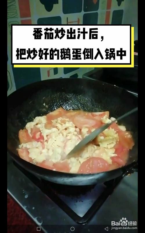 番茄里面的汁水炒出来以后,把之前炒好的鹅蛋倒回锅中