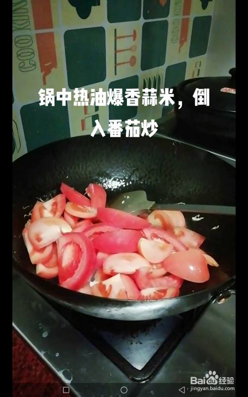 锅中加少许底油,爆香蒜米后,把番茄倒入锅中炒