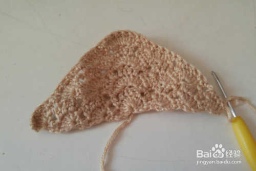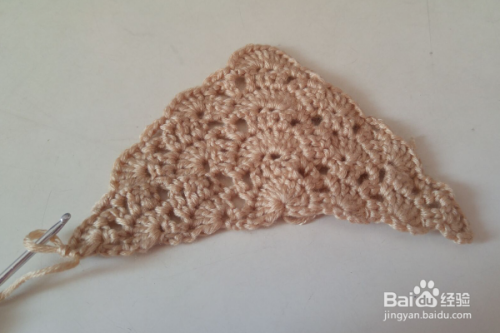 4圈:翻过来进行钩织,拉3个辫子针,在下一个长针上钩织1个长针,然后拉3个辫子针,在下一针上钩织1个短针,拉3个辫子针,在依次钩织2个长针,,然后在3辫子针形成的洞洞里钩针1个短针,再在下一组长针上钩织2长针,拉3个辫子针,钩织1短针,再拉3辫子针,然后还是钩织4个长针,拉3辫子针,再在下一针上钩织1个短针,拉3个辫子针,再钩织2长针,在3辫子针形成的洞洞里钩针1个短针,在余下的5长针上钩织2长针,拉3辫子针,钩织1短针,再拉3个辫子针,再钩织2个长针,结束这一圈的钩织。