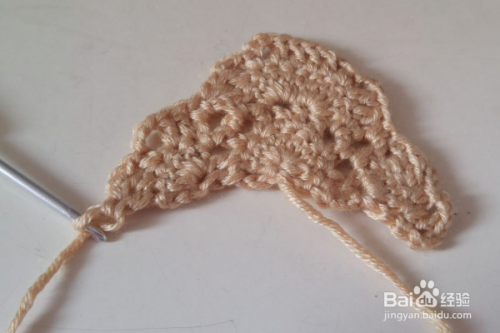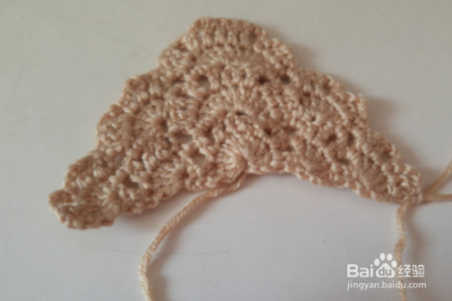 3圈:翻过来进行钩织,拉3个辫子针做这一圈的起立针,然后在立的针目里钩织4个长针,在3辫子针形成的洞洞里钩织1个短针,再拉3个辫子针,再在下一个洞洞里钩织1个短针,然后隔一长针钩织5个长针,再在下一个长针上钩织5个长针,然后再在3辫子针形成的洞洞里钩织1个短针,拉3个辫子针,再在下一个洞洞里钩1短针,然后在上一圈立的3辫子针立钩5个长针,结束这一圈。