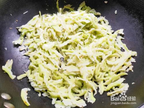 将腌制好的苦瓜片挤掉水份。放入炒锅煸干。