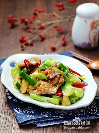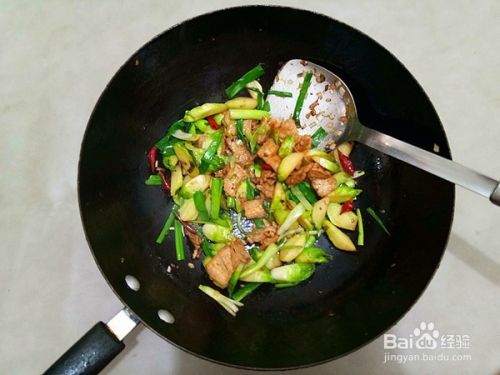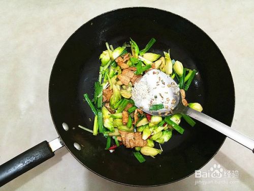 炒至青蒜断生,加入食盐、少许白糖、少许胡椒粉(鸡精)等条调料