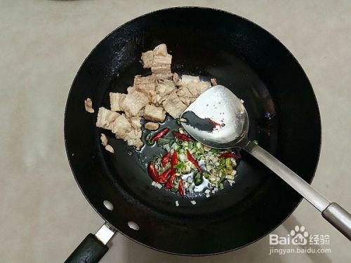 炒至五花肉变色肥肉部分透明,放入葱蒜末、干辣椒、和少许老抽