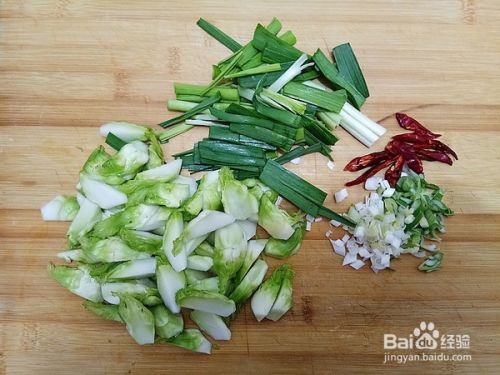 儿菜切片,青蒜切段、青蒜蒜白部分切些末、葱切末、干辣椒切段