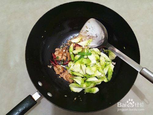 炒至葱蒜末出香味,肉片上色放入切好的儿菜大火快炒
