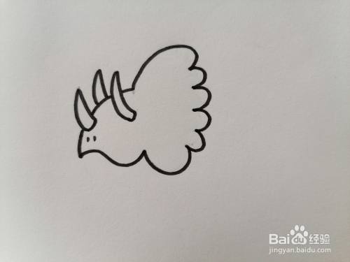 首先在纸上画出三角龙的头部,在头上画三只尖角