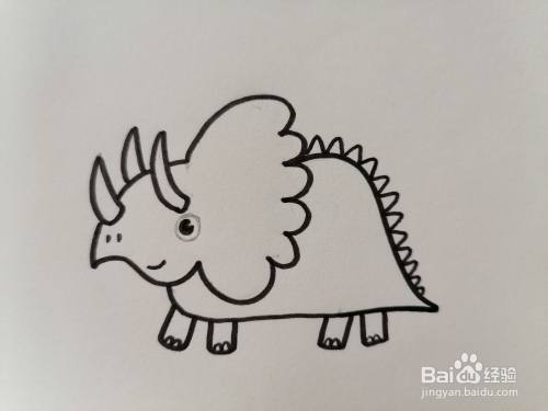 在三角龙后背画一排小三角形,再画出它的眼睛和嘴巴