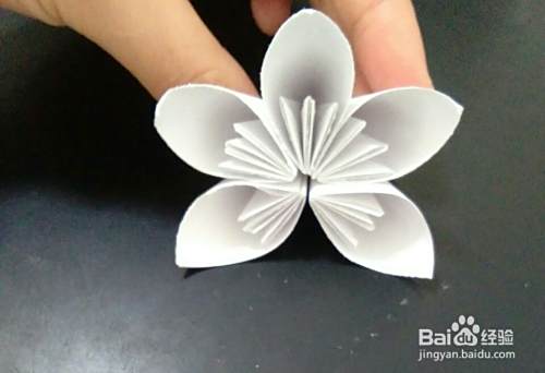 把折好的5个花瓣用胶水固定在一起,就做好一个漂亮的樱花花朵了。(如图)