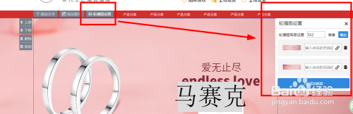 店招制作完成后,按照正常的首页排版接下来是轮播海报,主要介绍了店铺的热销、新品、活动信息等等。这里放置了两个轮播海报,点击图片就可以替换图片,点击文字编辑文字。点击轮播图设置可以设置轮播图的链接。