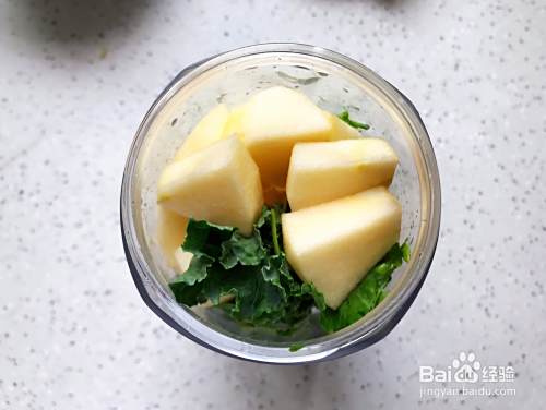 把甘蓝,芝麻菜和苹果放进榨汁杯