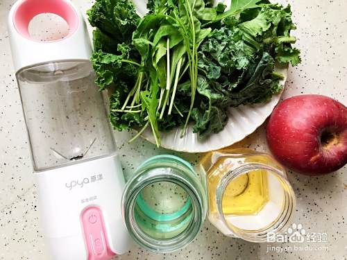 首先,我们准备好了所有的原料:甘蓝40克,芝麻菜15克,饮用水400-450克,苹果(约250克),蜂蜜,注意!这是两杯的量。如果你只需要做一个杯子,就要用一半的量~
