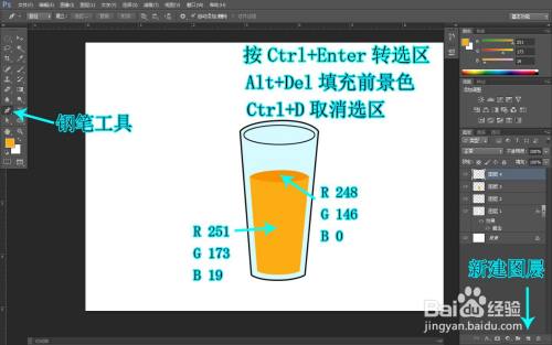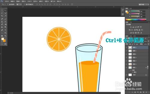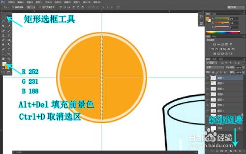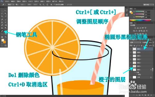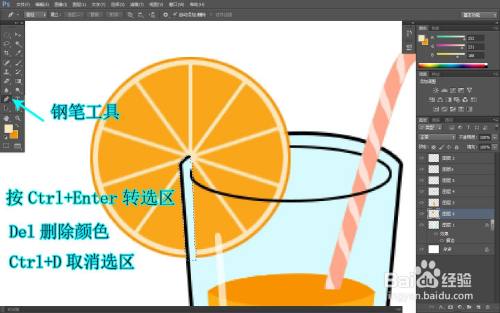 将橙子和杯子壁交叉处用钢笔绘制路径,转为选区删除橙子图层的颜色