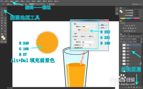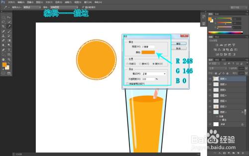 下面制作橙子,椭圆选框工具按Shift键绘制正圆形,填充颜色并描两次边,参数如图