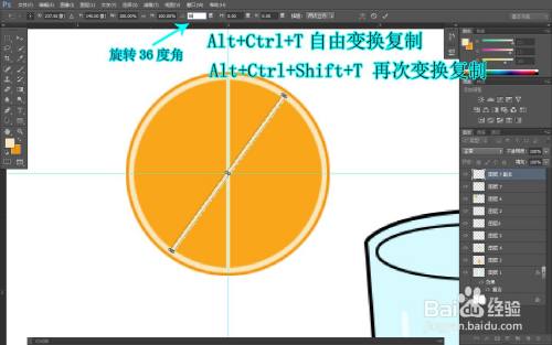 按Alt+Ctrl+T,调整角度,按Enter确认,按三次Alt+Ctrl+Shift+T复制旋转,做出如图效果,将橙子的图层全合并